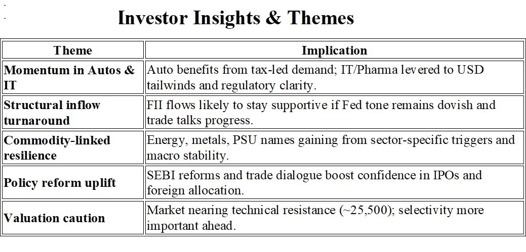 • Nifty +0.9%, Sensex +0.9%, marking the third consecutive weekly gain, with closing levels near Nifty 50: 25,327, Sensex: 82,626• Broader indices outperformed: Midcaps +1.5%, Smallcaps +2.9%